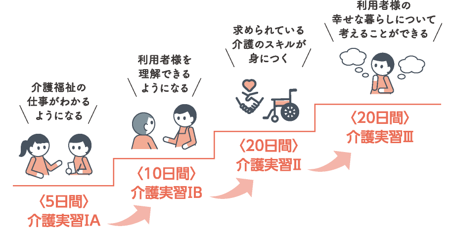 利用者様一人ひとりの状態に合わせた支援を考え、職場の仲間と協力して丁寧な介護ができるようになる力を身につけます。